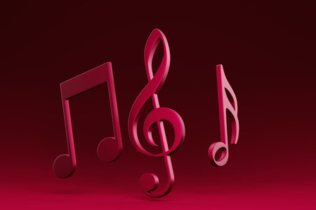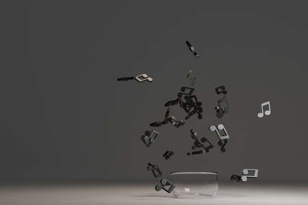 Music notes with dark background, floating notes, 3d rendering. Computer digital drawing.