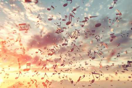 Musical symbols in beautiful sunset sky with clouds. Banner design