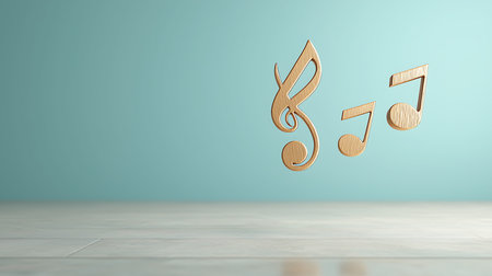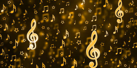 A concept showing literal gold metallic music symbols and notes on the five wavy octave lines on a spotlit background