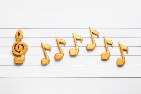 Top view of black paper cut music notes on white background