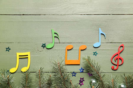 Music notes and Christmas decor on dark background