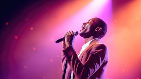 Young african-american singer performing on stage with colorful lights