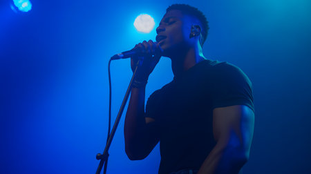 Energetic performer captivates the audience with a powerful vocal performance under stage lights.
