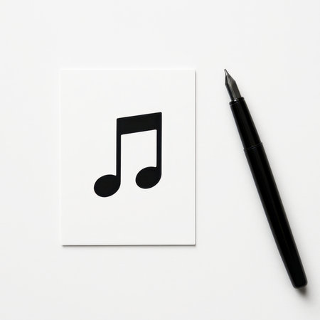 Top view small white card printed with single black music note beside diagonal fountain pen on white background creative songwriting stationery and audio art design