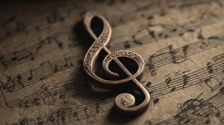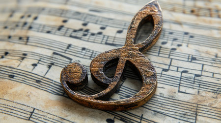 This captivating image features a vintage treble note resting on aged sheet music, creating a beautiful blend of art and music. Perfect for creative projects!