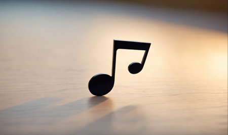 A black musical note rests on a white surface illuminated by a warm light