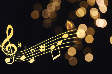 Music notes on dark background, bokeh effect