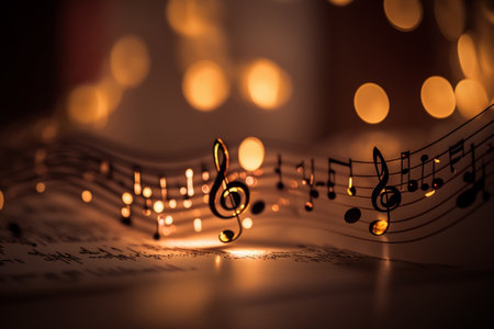 A close-up of a sheet of music with golden music notes and warm lights in the background, symbolizing creativity and harmony.