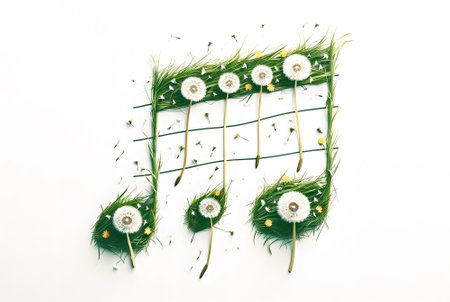 Dandelions and green grass like musical notes on a white background. Flat lay abstract minimal spring concept