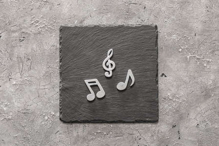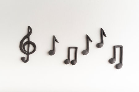 Black volumetric notes and violin key on white background top view. treble clef. Key of G