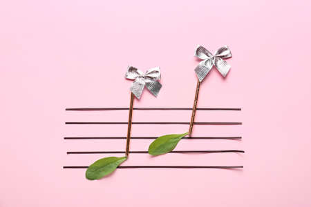 Music notes made of candies on color background