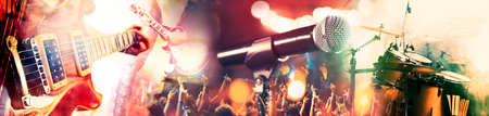 concert stage on rock festival, music instruments silhouettes, colorful background with copy space