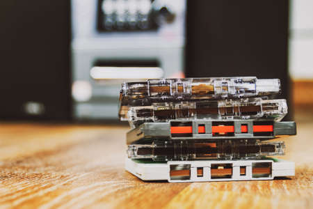 Compact cassette tapes and cassette recorder on wooden table. Retro music style. 80s music party. Vintage style. Analog equipment. Stereo sound. Back to the past