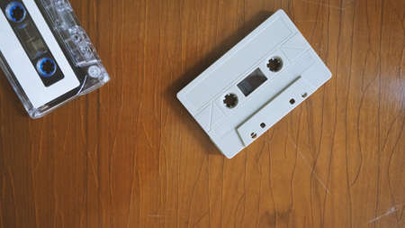 Old audio cassette on a wooden background. Close up white audio cassette. High quality photo
