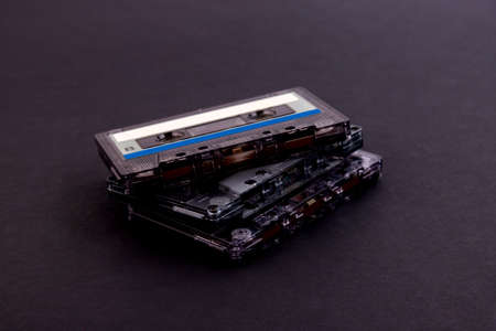Old audio cassettes with retro music. View from above. Music media from previous years.