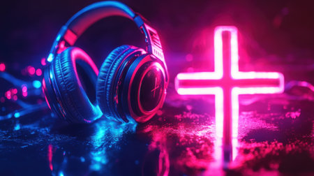 Close-up of a glowing cross with vibrant headphones resting on top, highlighting spirituality and sound.