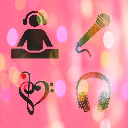 Pink modern background with black music silhouettes for podcasts.