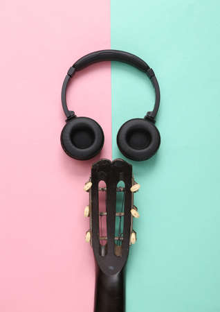 Acoustic guitar neck and headphones on pink blue background. Online guitar lessons. musical concept. top view. flat lay