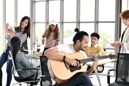 Group of business persons relaxing, playing guitar and chatting during break time at the office