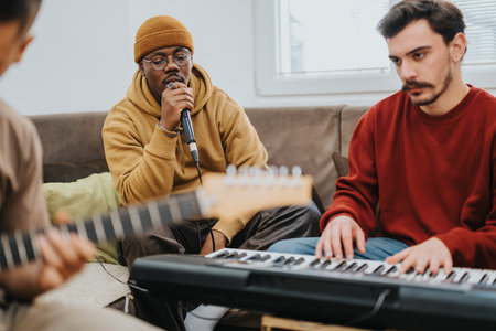 Three friends jam session at home, singer with microphone while others play keyboard and guitar