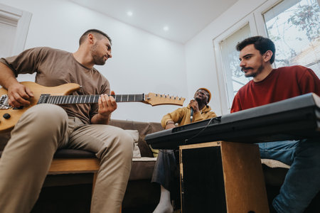 Three friends jam at home with guitar, keyboard, and microphone in a cozy living room