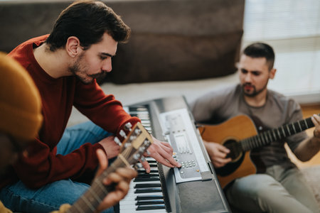 Friends playing music at home: man on keyboard and guitarist in living room