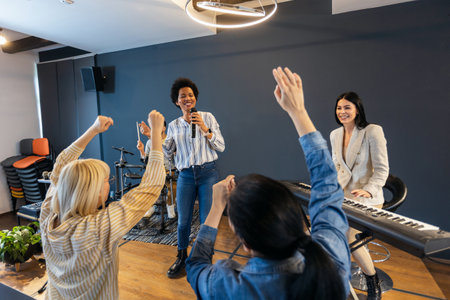 Business people making team training exercise during team building seminar singing karaoke.