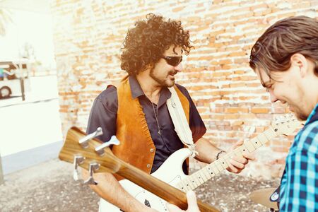 Close-up men, electric and acoustic guitar players at concert. Rehearsal base Concept of art, music, style