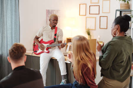 Group of young intercultural friends sitting by small table with snacks and flute and listening to singing of African guy playing guitar at party