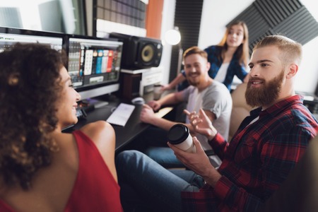 Two singers and sound engineers in the recording studio. They are engaged in mixing the songs of girls. They are in a modern recording studio.