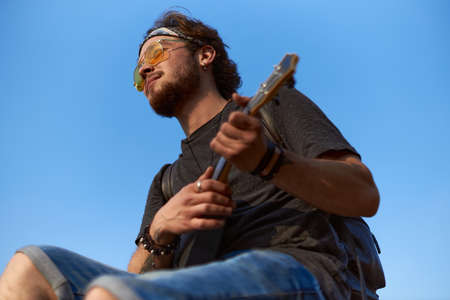 portrait of a young hippie man who sits in sunglasses with his eyes closed and plays the ukulele. High quality photo