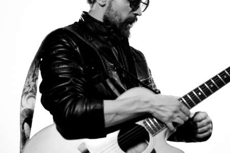 A man holds a guitar in his hands music emotions black leather jacket dark glasses studio light background