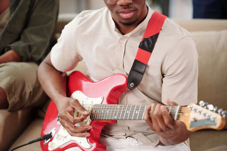 Young African man in casualwear playing electric guitar while sitting on couch