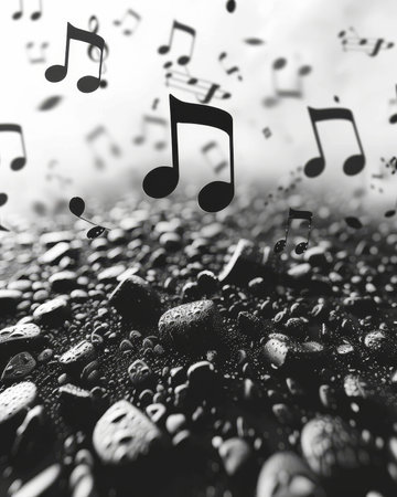 A captivating visual of flowing music notes across a reflective water surface, showcasing serene ambiance with soft lighting and artistic depth. Perfect for creative projects.