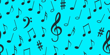 Seamless flying musical notes on blue. Musical symbols for banner of festival, print design, melody recording, design back layers. Template musical notation symphony signs, notes for sound tune music