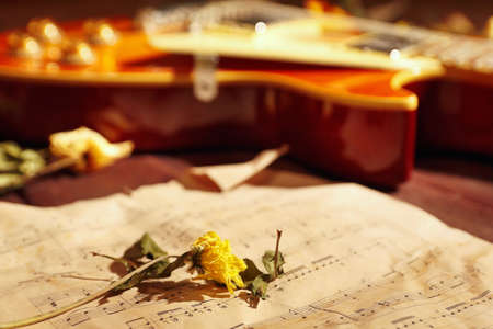 Vintage electric jazz guitar, dried flowers and old sheet music close up.
