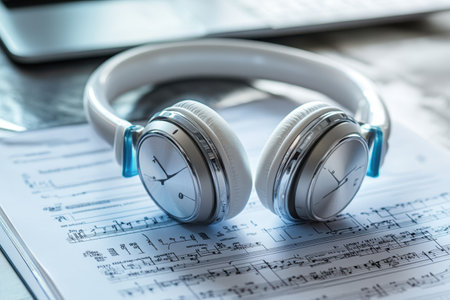 White headphones are placed on sheet music, hinting at a musical session near a laptop.