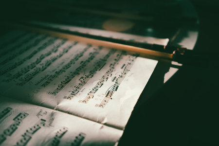 A close-up image of an open musical score with light highlighting the notes, evoking a vintage, emotional, and nostalgic tone. The cinematic realism adds depth and warmth.