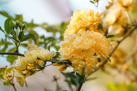 Climbing rose \'Golden Showers\'. Bush of yellow climbing roses in a garden with blue sky background.
