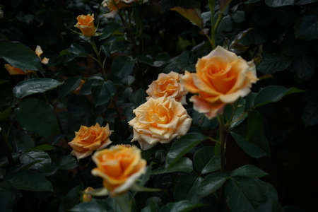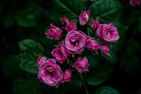 Beautiful bush of pink roses in a spring garden. Flower field. Field of tea rose. Rose garden.