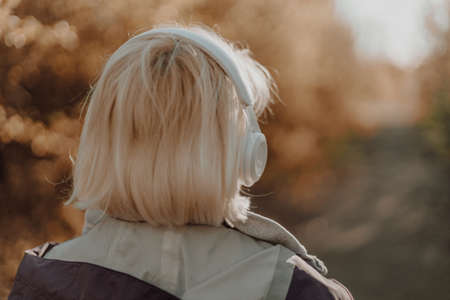 Back view of caucasian young woman listening music with headphones on sunny day while walking in city park