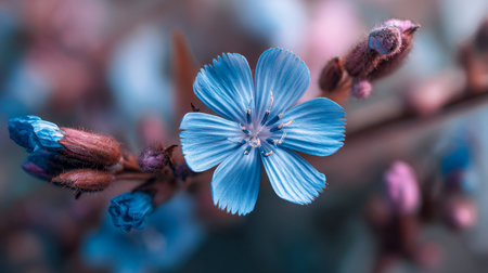 A gentle blue blossom emerges among tender pink buds, showing intricately detailed petals and stamens in a serene natural scene bathed in soft, calming light.