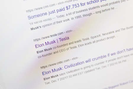 Minsk, Belarus - Dec 10, 2021: Google search result for Elon Musk