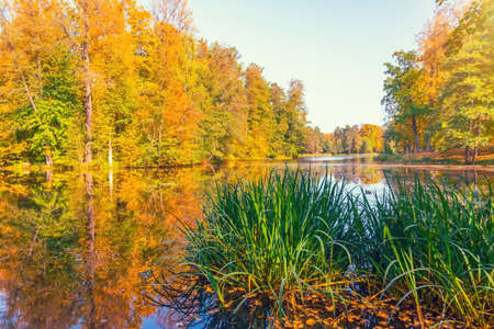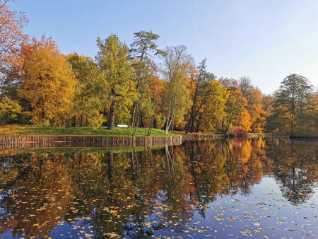 A pond in the park on Elagin Island, which reflects trees growing on the banks with bright autumn leaves, blue sky and fallen leaves floating.