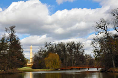Lednice Minaret - Romantic lookout tower in Castle Park (UNESCO). A tower on the banks of Castle Pond, surrounded by trees, and a blue sky with clouds
