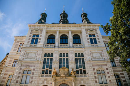 Colorful neo-renaissance building of the Museum of West Bohemia in the center of Plzen in sunny day. Pilsen, Czech Republic, August 1, 2020