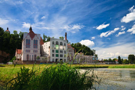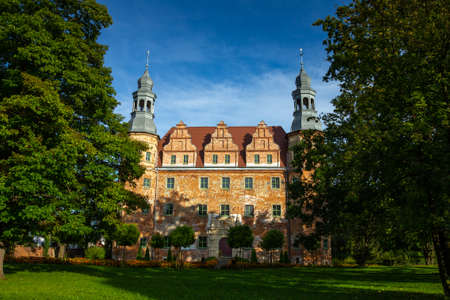 Palace in Polska Cerekiew over the blue sky. Sunny day. Summer time.