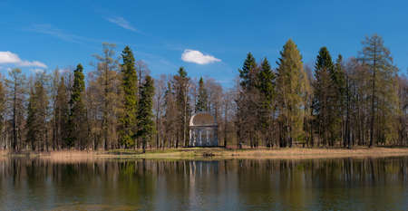 St. Petersburg, Gatchina Park, Pavilion of Eagle Island at White Lake. Trees and the pavilion reflected in the water.