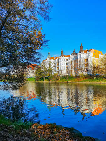 Wroclaw, Poland - November 13 2020: Small moat river near small park and promenade