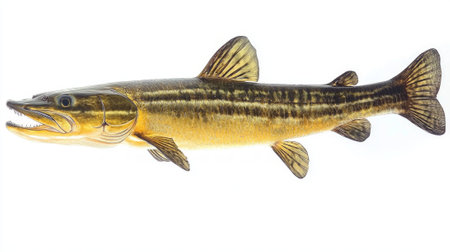 Muskellunge known for its elongated body and distinctive markings is displayed prominently with clear details. This specimen emphasizes its fierce appearance.